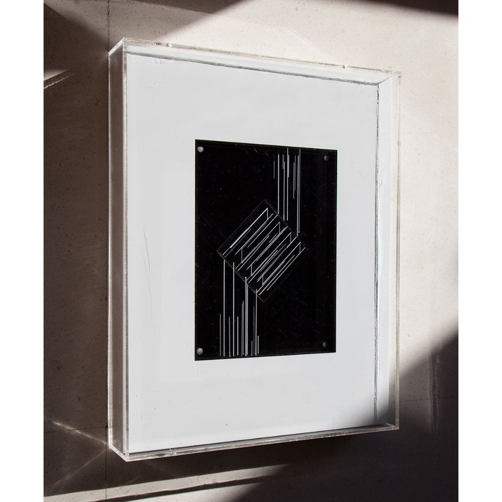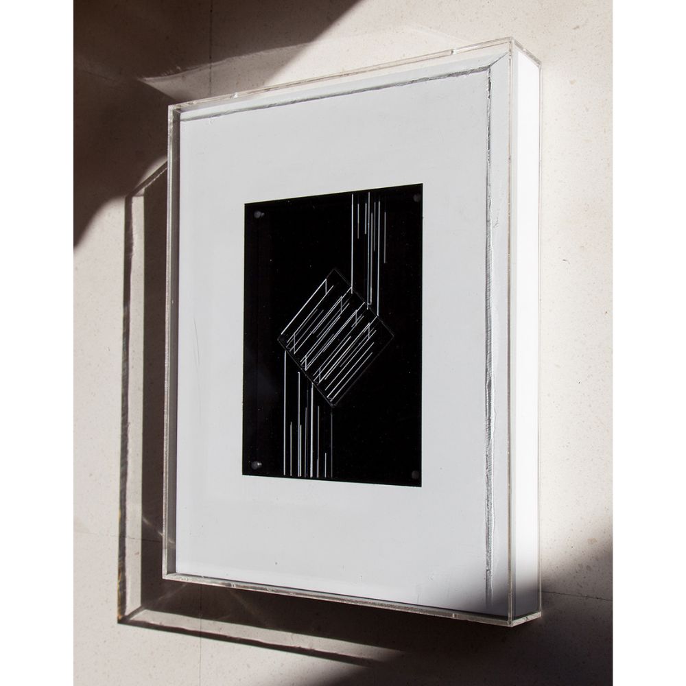 Técnica Acrílico sobre piezas de metacrilato insertado en bastidor y contenido en urna de metacrilato